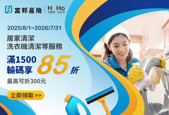 於HoHo好服務官網,預約居家清潔、洗衣機清潔等,任一居家服務滿1500元,輸入指定折扣碼享85折(最高可折300元)。