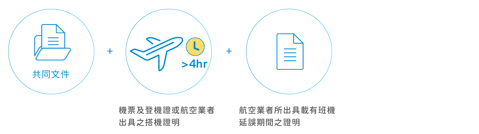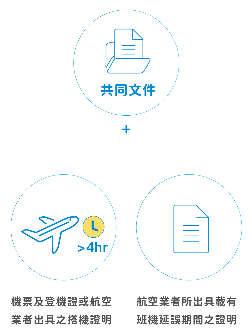 - 若班機取消或延遲且延誤時間達保單條款中所約定之時數,請記得向航空公司索取相關文件證明。